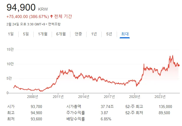 주가를 95,000원으로 가정하고, 1주당 연 배당금을 6,000원정라고 계산하면